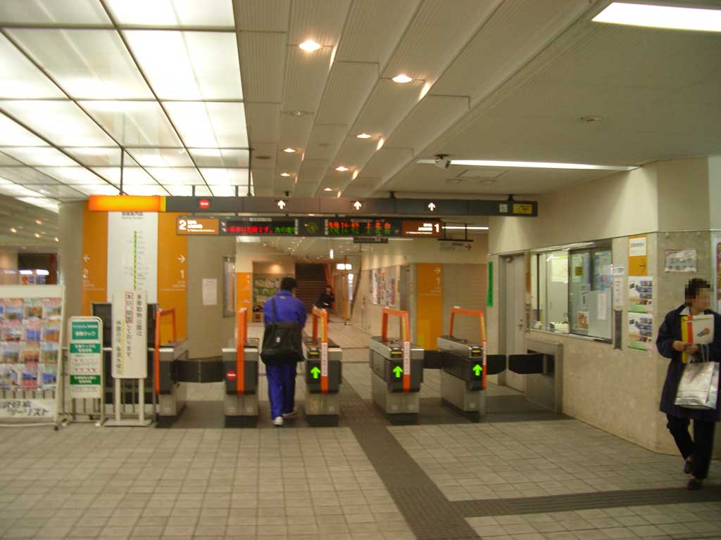 多摩モノレール多摩駅。モノレールの駅はどこも同じようなデザインなんですが、多摩駅だけは改札右の角が面取りしてあるんですよね。作中背景では、この右にも広がりがあるように思ってたんですが、実際にはこの右は券売機です。